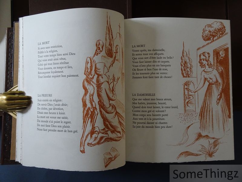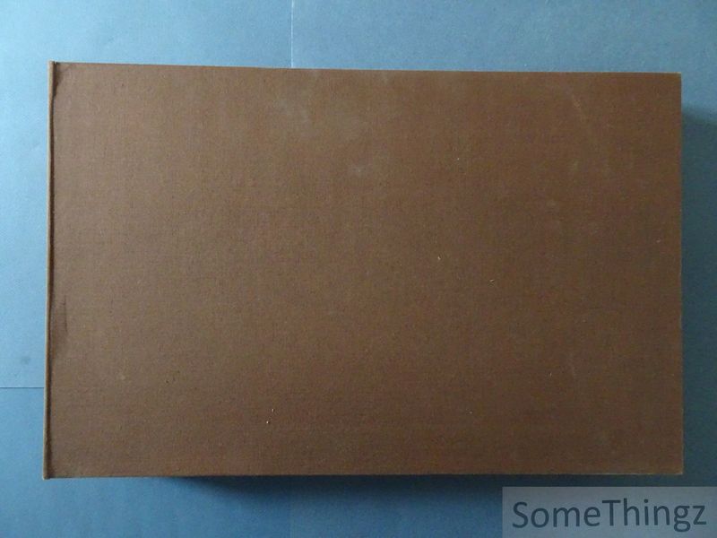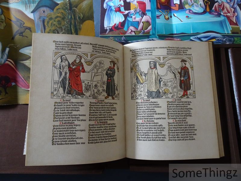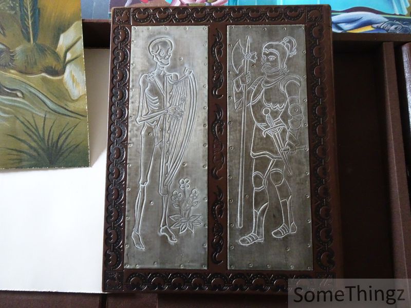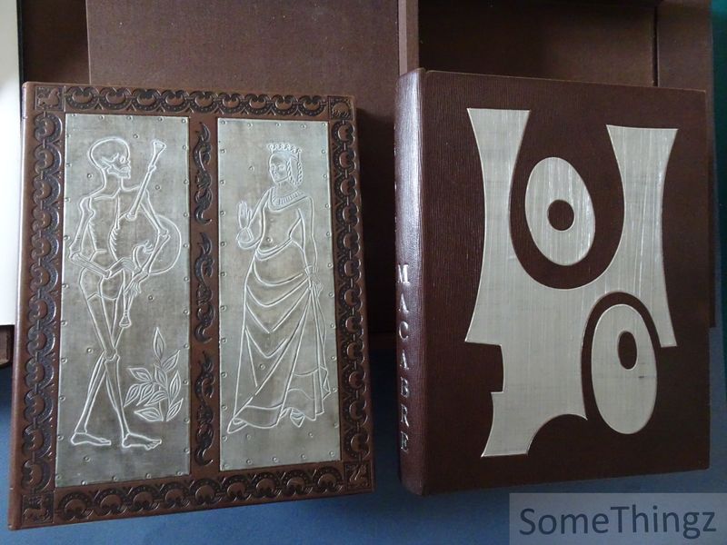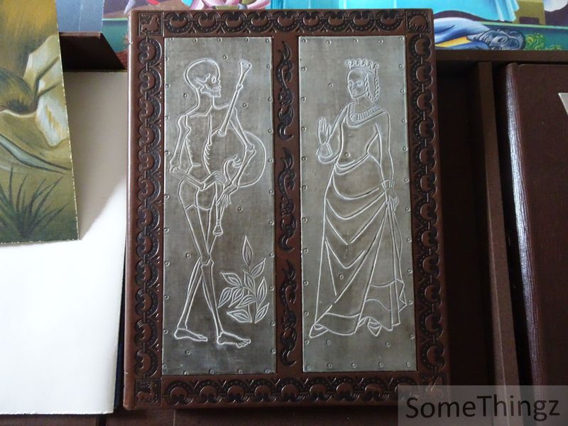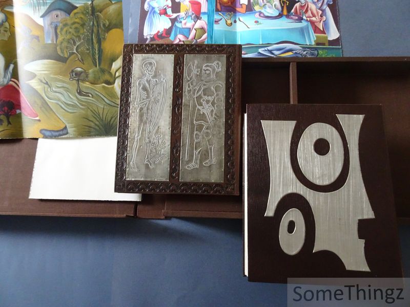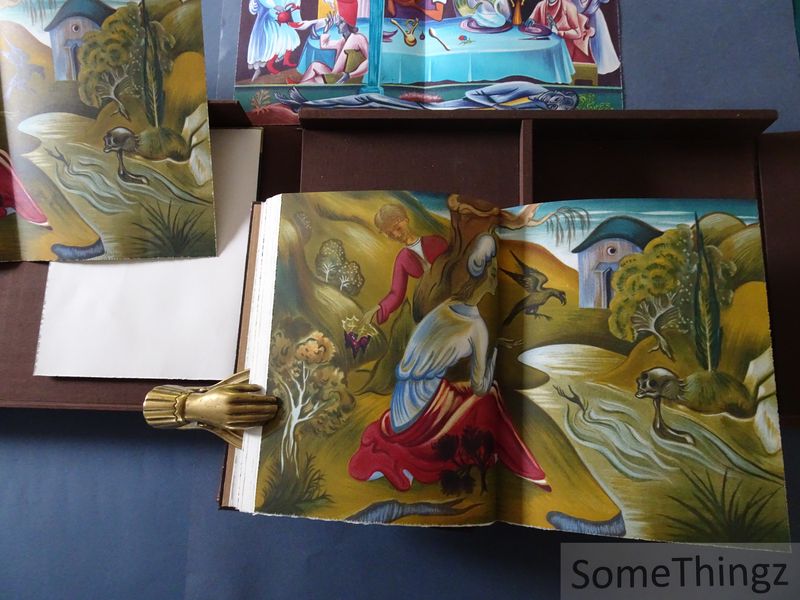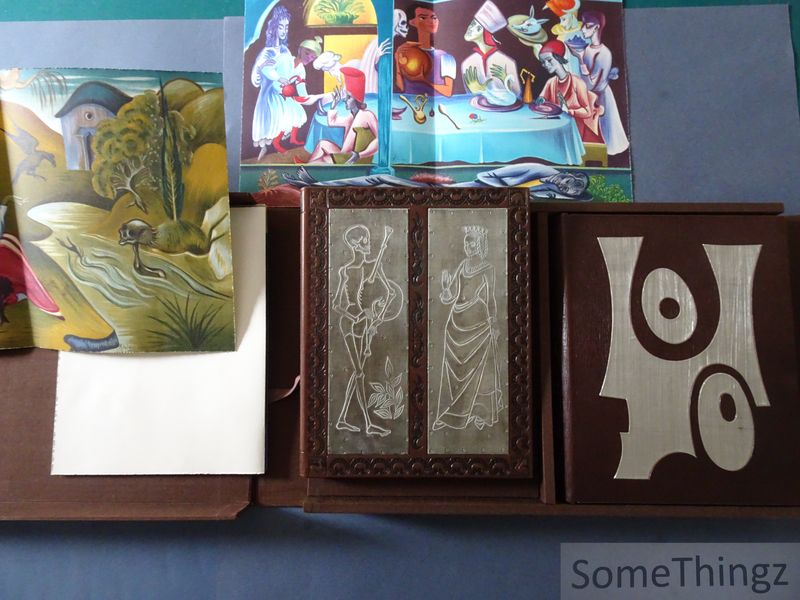 Exemplaire de luxe. 2 volumes dans le coffret orig. en toile (32x49cm.), reliures en plein veau fauve avec sur les plats des pièces metalliques comme décoration (1e vol.: reliure avec decorations en style médiévale, facsimile de texte orig. de 1491, ca. 76 pp. non-num., ills. en couls. in text - 2e vol.: reliure avec décorations abstraits, ca. 300pp. non-num., avec ills in texte monochrome et des ills. hors-texte en couls, 23x28.5cm), avec une suite de 10 compositions de Rhigas (dont 3 double-page).