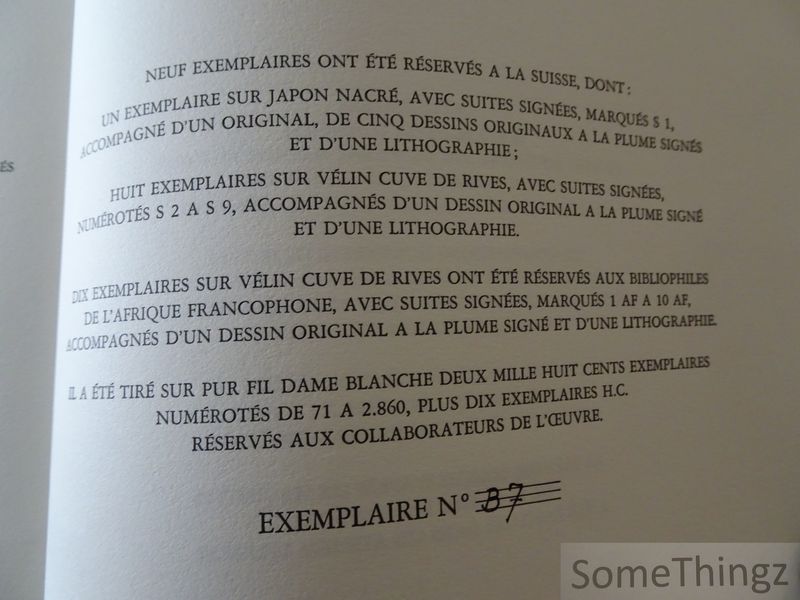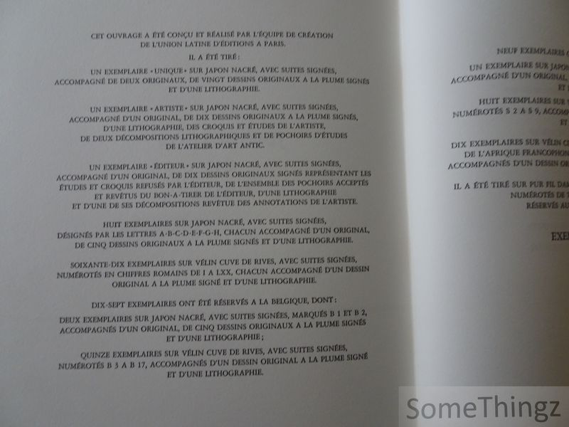 N° B7 de 15 exemplaires pour la Belgique mais SANS un dessin original et une lithographie de Rhigas (seulement le suite de 10 compositions est présente). Le bois gravés de l'édition ancienne ont été mis en couleurs a la main dans l'atelier d'enluminure d'art Antic. La reliure, conçue d'apres les maquettes de M. et MMe Lobstein-Crété, a été exécutée dans les Ateliers Reliural.