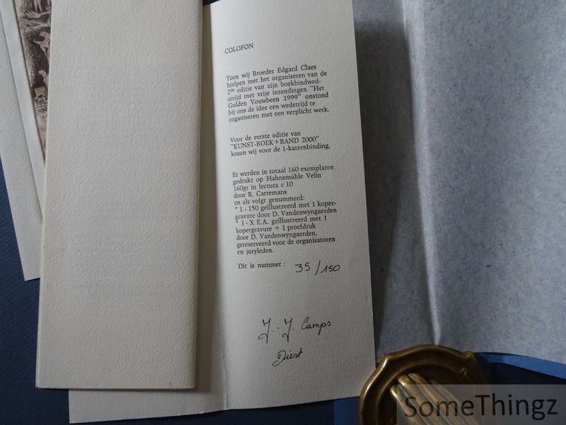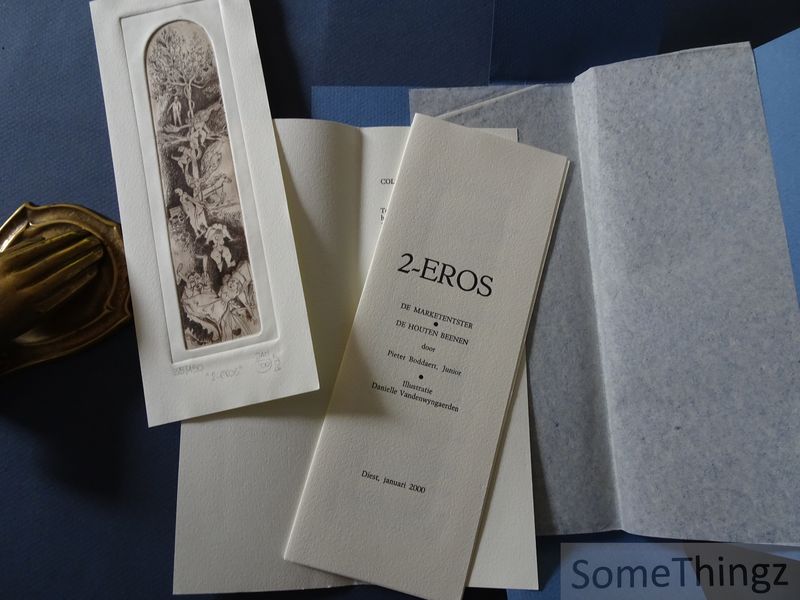 Deze bibliofiele uitgave werd door boekbinder J.J. Camps uit Diest uitgegeven op 160 exemplaar waarvan 150 met 1 originele kopergravure door D. Vandenwyngaeden. Deze publicatie verscheen werd ingezonden voor de eerste editie van de wedstrijd "KUNST-BOEK+BAND 2000". Hier werd gekozen voor een 1-katernbinding. Pieter Boddaert Jr. (1766-1805): Leven en werk. Pieter Boddaert Jr. werd in oktober 1766 geboren te Utrecht als zoon van een vooraanstaande familie. Na zijn gymnasiale opleiding schreef hij zich in aan de Universiteit van Utrecht, waar hij rechten studeerde. Zijn intellectuele vorming stond in het teken van de klassieke geleerdheid, maar al vroeg ontwikkelde hij een voorliefde voor de dichtkunst. Na zijn studie vestigde Boddaert zich als advocaat in Amsterdam, waar hij in de literaire en maatschappelijke kringen van de late achttiende eeuw actief deelnam. Hoewel Boddaert tot de gegoede burgerij behoorde, stond zijn literaire productie in schril contrast met de morele ernst die doorgaans met zijn stand werd geassocieerd. Zijn oeuvre omvat onder meer de bundel Gedichten uit de Gevangenis (1792) en de postuum verschenen Nagelatene poëtische en prozaïsche portefeuille (1805). Deze werken tonen een schrijver die zich weinig gelegen liet liggen aan conventionele zedelijkheid. Zijn poëzie werd gekenmerkt door een uitgesproken erotisch en speels karakter, dat hem in de literatuurgeschiedenis de bijnaam ?de vieze Boddaert? heeft opgeleverd. De expliciete toon en lichamelijkheid van zijn verzen sloten aan bij een traditie van libertijnse en satirische poëzie, maar overschreden in de ogen van tijdgenoten niet zelden de grenzen van het betamelijke. Boddaerts werk werd echter niet uitsluitend gewaardeerd om zijn erotische thematiek. Literatuurhistorici wijzen er ook op dat zijn gedichten een scherp gevoel voor ironie en een subtiel taalspel tentoonspreiden. Zijn libertijnse poëzie weerspiegelde bovendien een bredere maatschappelijke en culturele dynamiek van de patriottentijd en de vroege Bataafse Republiek, waarin gevestigde normen en machtsverhoudingen ter discussie werden gesteld. Het leven van Boddaert eindigde tragisch en voortijdig. Op 9 maart 1805 overleed hij te Amsterdam na een ongeval: bij een val van een grachtmuur op het bevroren water brak hij een been, waaraan hij bezweek. Zijn vroege dood versterkte de mythevorming rond zijn persoon en oeuvre. In de literaire traditie neemt Pieter Boddaert Jr. een marginale maar intrigerende positie in. Hij behoort niet tot de canon van de Nederlandse letterkunde, maar zijn werk wordt vaak genoemd als voorbeeld van de schaduwzijde van de achttiende-eeuwse poëzie: de uitbundige, zinnelijke en satirische verzen die contrasteerden met de burgerlijke moraal. Daarmee vormt Boddaert een belangrijke stem in het bredere spectrum van de Nederlandse literatuur aan het einde van de achttiende eeuw.