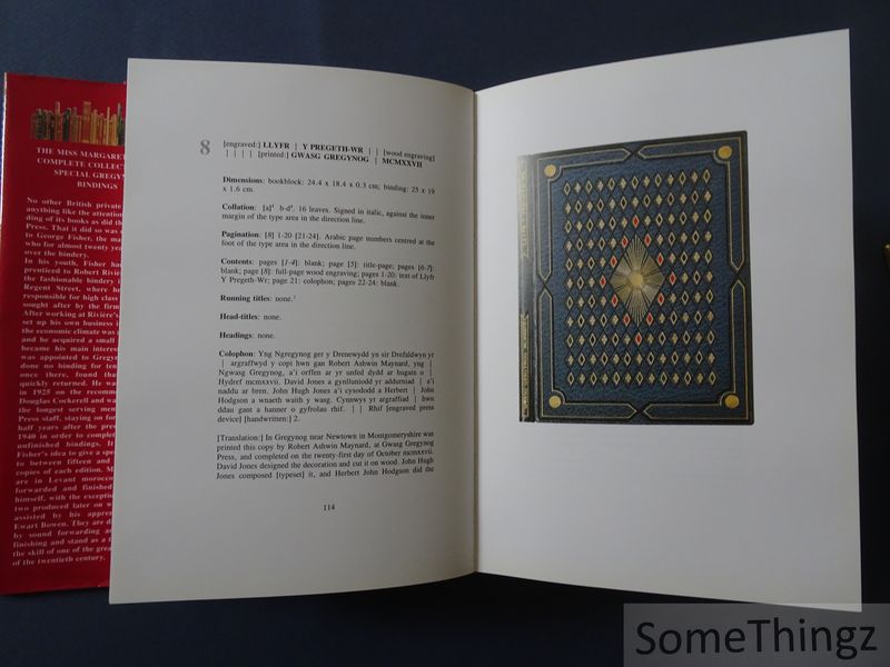 This book is a descriptive and illustrated catalogue of the special bindings produced for the Gregynog Press commissioned by Margaret Sidney Davies. It provides a complete listing of all the special (i.e. deluxe, full morocco or otherwise specially bound) Gregynog editions in her collection, with bibliographic data, binding descriptions, illustrations (many in colour), provenance notes, and cross references (bibliography and index). It begins with introductory material (by Dorothy Harrop) setting out the history of Gregynog?s binding programme under Davies? patronage, then proceeds through each title in turn, describing the design, materials, tooling, binder, and surviving copies. The volume is lavishly illustrated with colour plates and binding detail photographs, and is intended as a reference for collectors of Gregynog bindings and those studying the aesthetics and history of private press fine binding. A Gregynog binding typically refers to a ?special binding? commissioned for a Gregynog Press publication. The Gregynog Press (founded in 1922 by Margaret and Gwendoline Davies) published limited-edition books, some of which were issued in a ?special binding? (as opposed to the ordinary binding). These special bindings were created by skilled binders (notably George Fisher, designs by craftsmen such as Blair Hughes-Stanton, Horace Walter Bray, etc.), often in fine leather (e.g. morocco or Levant), with gilt tooling, decorative designs (cross motifs, Celtic, interlacing, inscriptions), spine bands, and sometimes with elaborate endpapers or doublures. Each special binding was essentially a bespoke binding made to high craftsmanship standards, often as a deluxe presentation copy. The catalogue of Gregynog?s special bindings is comparatively small (only a modest number of books were so treated). The special bindings serve not only as functional protective covers but as artistic objects in themselves, often reflecting the design ethos of the private press movement and the patron?s aesthetic. The scholarship on Gregynog special bindings aims to document the variety, provenance, binder attribution, tooling styles, and interrelations between binding design and the text within, thereby contributing to the study of private press bindings, binding history, and bibliographic description.