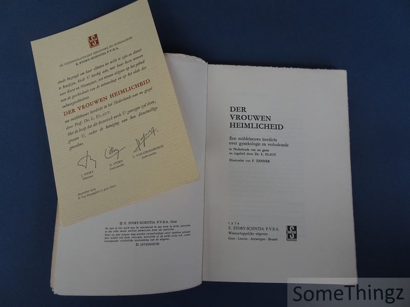 Dit boek is de modern-Nederlands hertaling en inleiding van een middeleeuws leerdicht getiteld Der Vrouwen Heimlicheid, dat oorspronkelijk uit de late dertiende of vroege veertiende eeuw stamt. De tekst, gebaseerd op het Latijnse De secretis mulierum (toegeschreven aan pseudo-Albertus Magnus), behandelt in dichtvorm onderwerpen rond gynaecologie en verloskunde in de middeleeuwen: conceptie, geslachtsorganen, menstruatie, zwangerschap, geboorte, invloeden van sterrenbeelden, en methodes om het geslacht van het ongeboren kind te bepalen. De vertaler voegde lyrische onderbrekingen toe waarin hij zich vaak richt tot een geliefde vrouw, wat de klassieke medische instructie combineert met hoofse elementen. L. Elaut heeft het oorspronkelijke Middelnederlandse vers aangevuld met een hedendaagse Nederlandse vertaling, toelichtingen, een inleiding, en opmerkingen over de tekst en de manuscripttraditie. De editie bevat ook een facsimile van de omslag of handschriftgegevens volgens Jan Frans Willems? beschrijving, en kantlijnillustraties van F. Zenner.