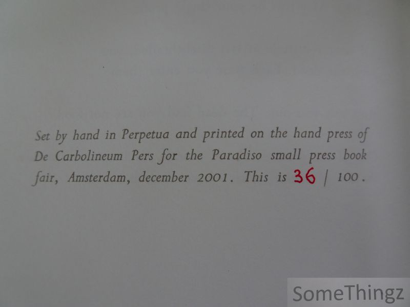 Set by hand in Perpetua and printed on the hand press of De Carbolineum Pers for the Paradiso small press book fair, Amsterdam, december 2001. This is n°36 of 100 copies. This copy has an artistic binding consisting of 2 wooden boards laced with nylon thread along 2 fine metal strips.