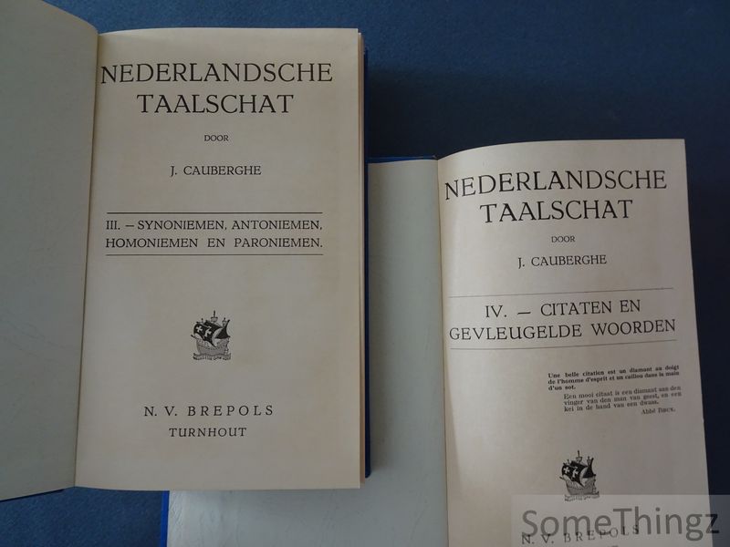 Deze reeks "Nederlandsche Taalschat" in vier delen door J. Cauberghe is een naslagwerk verzameld rond Nederlandse spreekwoorden, spreekwijzen, synoniemen en citaten. Deel I behandelt spreekwoorden en spreekwijzen; deel II spreekwijzen, uitdrukkingen en gezegden; deel III synoniemen, antoniemen, homoniemen en paroniemen; deel IV citaten en gevleugelde woorden, waaronder zowel klassieke (Latijnse) als Noord- en Zuid-Nederlandse, Franse, Engelse en Duitse citaten. Het werk richt zich op een breed publiek met interesse voor de Nederlandse taal, letterkunde en spreekwoordkunde, en dient als rijk en systematisch naslagwerk voor taalgebruik, etymologie en literair-culturele uitspraken.