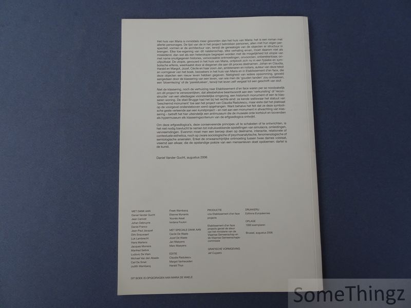 Dans le cadre de Bruges 2002 Capitale Culturelle Européenne, à l?occasion du projet Wijk-up dans le quartier Sint-Jozef, une maison d?habitation ordinaire est ouverte au public par complicité entre l'habitante et l'artiste. Elles en font un musée. La propriétaire Maria De Waele continue d?occuper les lieux et devise avec Claudia Radulescu des effets de la muséalisation. Claudia Radulescu se donne pour projet de commuer ce musée « vrai » en construction utopique. « L?esprit moderne », sur les versants d?une installation et d?une publication, déplie les volumes et les surfaces d?une chronologie de l?inclassable. Etablissement d?en Face ouvre temporairement son espace à cette « habitation » déménagée. «L?esprit moderne », sur les versants d?une exposition et d?une publication, déplie les volumes et les surfaces d?une chronologie de l?inclassable. / During 2002, the year in which Bruges held the title Cultural Capital of Europe, Claudia Radulescu participated in the project Wijk-Up in the Saint-Josef district, making a modest home, complete with its household accoutrements, into a museum. The resident, Maria De Waele, continued to live in her house unabated all the while, speculating with Radulescu as to what this museum-isation would actually affect. Claudia Radulescu continued with this veritable museum as a utopist possibility. Invited by Etablissement d?en Face to utilize the gallery space, Raduelscu has been able to realize the temporary placement of this veritable museum. Both as an exhibition and as a publication, THE MODERN SPIRIT poignantly reveals a chronology of the unclassifiable. / In het kader van Brugge 2002, als Europese Culturele Hoofdstad, werd tijdens het project Wijk-up in de wijk Sint-Jozef een gewoon huis opengesteld voor het publiek. De bewoner en de kunstenaar werkten samen om er een museum van te maken. De eigenaresse, Maria De Waele, bleef er wonen en besprak de effecten van museificatie met Claudia Radulescu. Het project van Claudia Radulescu was om dit 'echte' museum te transformeren tot een utopische constructie. 'The Modern Spirit', een installatie en een publicatie, ontvouwt de volumes en oppervlakken van een chronologie van het onclassificeerbare. Etablissement d'en Face stelde tijdelijk zijn ruimte beschikbaar voor deze verplaatste 'woning'.