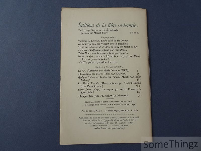 La flute enchantée: cahiers d'art poétique. Cahier N° 7. Armand Bernier - Raoul Cambiaggio - Jean Choisy - Jean Cocteau - Catherine Fauln - Michel de Ghelderode - Hélène Goblet d'Alviella - Jaques-Noir - Guy Jordens - Frédéric Kiesel - Mélot du Dy - Andrée Sodenkamp - Liliane Wouters - Jean-Jacques Gailliard.