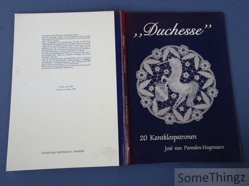 Duchesse 20 kantklospatronen is een Nederlandstalige instructie- en patronengids voor het ontwerpen en uitvoeren van Duchesse-kloskant. Deze publicatie biedt twintig verschillende patronen, elk voorzien van duidelijke foto?s, werktekeningen en begeleidende teksten zodat zowel beginnende als meer ervaren kantmakers de patronen kunnen reproduceren. De opzet combineert visuele voorbeelden met praktische uitleg om de traditionele Duchesse-techniek toegankelijk te maken en tegelijk inspiratie te bieden voor diverse toepassingen binnen het kloswerk. Duchesse 20 kantklospatronen bevat een systematische verzameling van twintig afzonderlijke patronen voor Duchesse-kloskant, een niet-continu kloskanttype dat gekenmerkt wordt door motieven verbonden via braids, naaiwerk en open vullingen. De inhoud omvat overzichtsfoto?s van afgeronde kantstukken, detailfoto?s van de patronen, prikkingen en werktekeningen, waardoor de gebruiker stap voor stap kan volgen hoe de ontwerpen zijn opgebouwd. Daarnaast biedt het boek een korte terminologielijst met vertalingen van betreffende termen in andere talen, wat bijdraagt aan de bruikbaarheid voor internationaal werkende kantliefhebbers. De combinatie van visuele en tekstuele elementen maakt het boek geschikt voor hobbyisten en ervaren kantmakers die met Duchesse-kloskant willen experimenteren of bestaande vaardigheden willen verfijnen. José van Pamelen-Hagenaars is een Nederlandse auteur en kantdeskundige die ervaring heeft opgedaan aan het Kantcentrum in Brugge en aanvullende opleidingen in technisch tekenen en toegepaste kunst volgde, waardoor zij haar kennis van kantklostechnieken heeft verdiept en eigen patronen kon ontwikkelen. Zij heeft in West-Zeeuws-Vlaanderen gewerkt aan de verspreiding van traditionele kanttechnieken en heeft haar expertise vastgelegd in Duchesse 20 kantklospatronen door middel van heldere uitleg en uitnodigende ontwerpen die de aloude Duchesse-traditie toegankelijker maken voor hedendaagse praktijken binnen de handwerkcommunity.