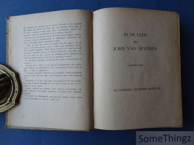 In de leer bij Joris van Severen bundelt in een enkele band drie ideologische teksten die de grondslagen uiteenzetten van het politiek en maatschappelijk denken van Joris van Severen, stichter en leider van het Verdinaso. Deel I, Algemeene Grondbeginselen, introduceert de fundamentele uitgangspunten van Van Severens denken, waaronder zijn visie op staat, gemeenschap, hierrarchie en autoriteit. Deel II, Het Dietsche Rijk en de Orde, werkt het geopolitieke en cultuurhistorische ideaal uit van een Dietse staat die de Nederlanden en aangrenzende gebieden zou verenigen binnen een autoritair ordeningsmodel. Deel III, De voorwaarden tot de verwezenlijking op de methode, behandelt de organisatorische, morele en strategische voorwaarden die volgens Van Severen noodzakelijk zijn om dit project te realiseren. Samen vormen de drie delen een systematische ideologische synthese die representatief is voor het Verdinaso-denken in het interbellum.