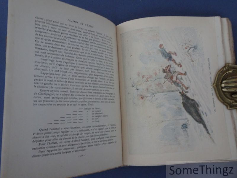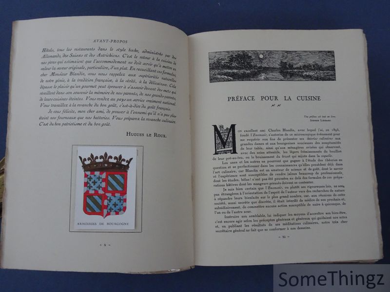 Cuisine et chasse de Bourgogne et d'ailleurs, assaisonnées d'humour et de commentaires est un ouvrage culinaire et cynégétique publié en 1920. L'ouvrage combine études, principes et recettes avec des commentaires humoristiques et anecdotiques sur les traditions de la cuisine et de la chasse en Bourgogne et dans d'autres régions. Il contient de nombreuses illustrations, gravures et hors-texte, dont deux eaux-fortes et des illustrations en couleur, accompagnant le texte et facilitant la compréhension des techniques. L'ouvrage est destiné aux femmes françaises, disciples de Saint-Hubert, touristes et bibliophiles, proposant des préparations de gibier et des réflexions sur les pratiques culinaires et les événements de chasse. Le livre commence par un avant-propos et des études introductives (XXXVI pages) exposant les objectifs de l'auteur : concilier traditions gastronomiques et pratiques de chasse avec une tonalité légère. Le texte principal est organisé thématiquement : pratique de la chasse, traitement du gibier, principes de préparation et méthodes classiques de la cuisine bourguignonne, suivi d'une section étendue de recettes. Les recettes incluent palombe, lièvre, faisan, cerf et autres gibiers, avec techniques de marinade, rôtissage et sauces, ponctuées de commentaires humoristiques et informatifs. Les illustrations dans le texte et hors-texte soutiennent l'explication pratique. Charles Blandin est un auteur français actif au début du XXe siècle, spécialisé dans les traditions culinaires et cynégétiques. Il publie cet ouvrage en 1920, une période où la culture gastronomique française est fortement liée aux traditions régionales et à la chasse. Le style de Blandin allie instructions pratiques et anecdotes humoristiques, montrant un large intérêt culturel et une position de connaisseur dans le monde de la gastronomie et de la chasse. Les illustrations riches et les contributions de contemporains comme Hugues Le Roux et Cunisset Carnot indiquent un réseau dans les cercles littéraires et culinaires.