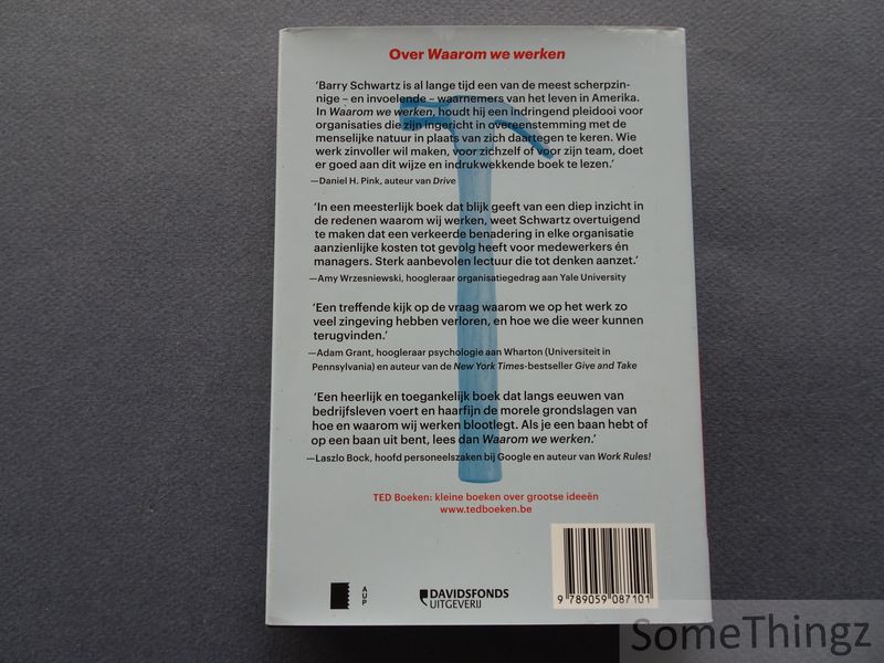 Waarom werken wij? Het lijkt zo 'n simpele vraag, maar het antwoord is verrassend, complex en urgent. Lange tijd is ons geleerd dat we in de eerste plaats werken om betaald te worden. De inrichting van onze samenleving is zelfs grotendeels aangepast aan dat denkbeeld. Waarom zijn zoveel mensen dan ontevreden met hun werk, ook al worden ze goed betaald? En waarom vinden sommige mensen wel grote vervulling en voldoening in hun werk, ook als het slecht betaald wordt? Barry Schwartz ontkracht de mythe van werken-voor-geld aan de hand van onderzoek naar werknemers uit alle economische geledingen - van ziekenhuizen tot kapsalons, van autofabrieken tot directiekamers. Schwartz laat zien welke trends en patronen leiden tot een gelukkige werkplek, en hij toont aan dat wat ons uiteindelijk drijft om goed werk te (willen) doen zich maar zelden laat sturen door prikkels - sterker nog, pogingen daartoe zijn vaak juist de oorzaak van slecht werk. Hoe hebben we onszelf zo kunnen misleiden? Hoe kunnen we de manier waarop we werken veranderen? Met veel inzicht en wijsheid leidt dit boek stapsgewijs naar een beter begrip van werk, en geeft houvast bij de zoektocht naar geweldig werk.