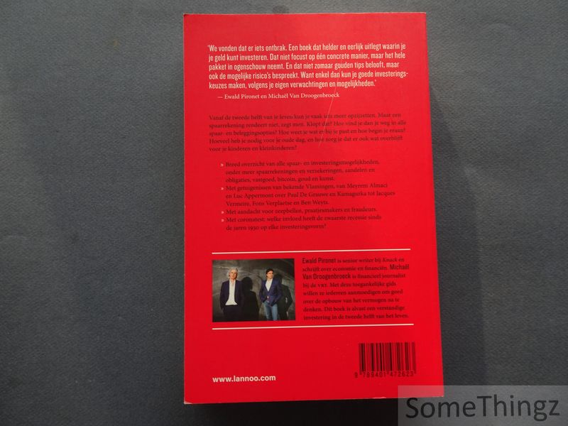 'We vonden dat er iets ontbrak. Een boek dat helder en eerlijk uitlegt waarin je je geld kunt investeren. Dat niet focust op één concrete manier, maar het hele pakket in ogenschouw neemt. En dat niet zomaar gouden tips belooft, maar ook de mogelijke risico's bespreekt. Want enkel dan kun je goede investeringskeuzes maken, volgens je eigen verwachtingen en mogelijkheden' (Michaël Van Droogenbroeck en Ewald Pironet). Vanaf de tweede helft van je leven kun je vaak iets meer opzijzetten. Maar een spaarrekening rendeert niet, zegt men. Klopt dat? Hoe vind je dan je weg in alle spaar- en beleggingsopties? Hoe weet je wat er bij je past en hoe begin je eraan? Hoeveel heb je nodig voor je oude dag, en hoe zorg je dat er ook wat overblijft voor je kinderen en kleinkinderen? Breed overzicht van alle spaar- en investeringsmogelijkheden, onder meer spaarrekeningen en verzekeringen, aandelen en obligaties, vastgoed, bitcoin, goud en kunst. Met getuigenissen van bekende Vlamingen, van Meyrem Almaci en Luc Appermont over Paul De Grauwe en Kamagurka tot Jacques Vermeire, Fons Verplaetse en Ben Weyts. Met aandacht voor zeepbellen, praatjesmakers en fraudeurs. Met handvatten voor onzekere tijden: welke invloed heeft de zwaarste recessie sinds de jaren 1930 op elke investeringsvorm?