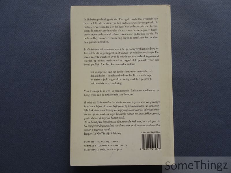 In Als de hemel zich verduistert onderzoekt Vito Fumagalli hoe mensen in de middeleeuwen hun bestaan en hun plaats in de kosmos ervoeren toen hemel en aarde nog niet vanzelfsprekend gescheiden waren. Dit werk belicht de cultuurgeschiedenis van het middeleeuwse levensgevoel, waarbij geloof, tijd, natuur en het dagelijkse leven onder een andere blik getoond worden dan in moderne percepties. Jacques Le Goff, vooraanstaand mediëvist, levert een inleiding waarin hij de relevantie van deze historische zienswijze voor het huidige denken onderstreept. Het boek nodigt uit tot reflectie over de wisselwerking tussen cultuur, religie en het menselijke bewustzijn in een tijd waarin hemel en wereld dicht bij elkaar stonden. Vito Fumagalli is een Italiaans cultuurhistoricus en auteur die zich richt op de interpretatie van historische leefwereldbeelden en de culturele verankering van religieuze en filosofische ideeën in de Europese geschiedenis. In Als de hemel zich verduistert brengt hij een synthese van historische inzichten over middeleeuwse gevoelswerelden die vandaag de dag nog resoneren in cultuur en religie.