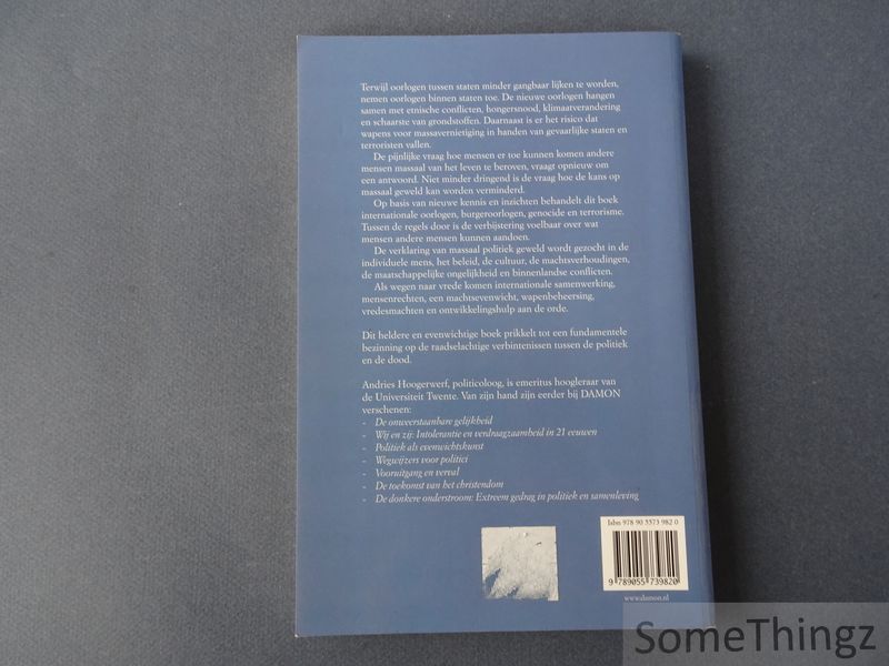 In De politiek en de dood : oorlog en vrede opnieuw bezien onderzoekt Andries Hoogerwerf waarom oorlogen ondanks vooruitgang in internationale relaties nog steeds voorkomen en hoe de oorzaken en gevolgen van massaal politiek geweld kunnen worden verklaard. Terwijl traditionele oorlogen tussen staten minder frequent lijken te worden, neemt het aantal conflicten binnen staten toe en raakt dit verbonden met etnische spanningen, schaarste van grondstoffen, hongersnood en klimaatverandering. Tegelijkertijd is er het risico dat wapens van massavernietiging in verkeerde handen vallen. Het boek combineert nieuwe inzichten uit cultuur, politiek, machtsverhoudingen en maatschappelijke ongelijkheid om te analyseren hoe mensen anderen massaal van het leven kunnen beroven en onderzoekt welke mechanismen kunnen helpen om de kans op massaal geweld te verminderen, zoals internationale samenwerking, mensenrechten, wapenbeheersing en vredesmachten, waardoor een brede en fundamentele bezinning ontstaat op de complexe relatie tussen politiek en de dood.