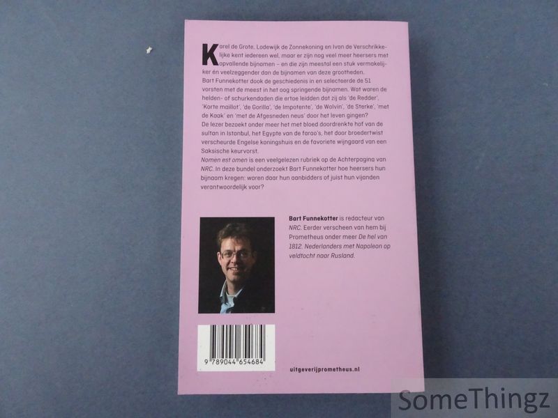 Karel de Grote, Lodewijk de Zonnekoning en Ivan de Verschrikkelijke kent iedereen wel, maar er zijn nog veel meer heersers met opvallende bijnamen, en die zijn meestal een stuk vermakelijker én veelzeggender dan de bijnamen van deze grootheden. Bart Funnekotter dook de geschiedenis in en selecteerde de 51 vorsten met de meest in het oog springende bijnamen. Wat waren de helden- of schurkendaden die ertoe leidden dat zij als 'de Redder', 'Korte maillot', 'de Gorilla', 'de Impotente', 'de Wolvin', 'de Sterke', 'met de Kaak' en 'met de Afgesneden neus' door het leven gingen? De lezer bezoekt onder meer het met bloed doordrenkte hof van de sultan in Istanbul, het Egypte van de farao's, het door broedertwist verscheurde Engelse koningshuis en de favoriete wijngaard van een Saksische keurvorst. Nomen est omen is een veelgelezen rubriek op de Achterpagina van NRC. In deze bundel onderzoekt Bart Funnekotter hoe heersers hun bijnaam kregen: waren daar hun aanbidders of juist hun vijanden verantwoordelijk voor?