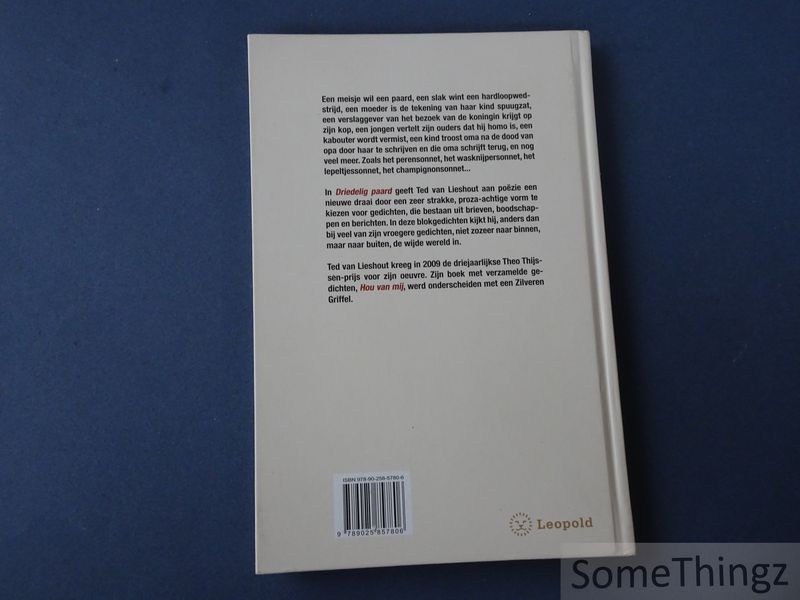 Een meisje wil een paard, een slak wint een hardloopwedstrijd, een moeder is de tekening van haar kind spuugzat, een verslaggever van het bezoek van de koningin krijgt op zijn kop, een jongen vertelt zijn ouders dat hij homo is, een kabouter wordt vermist, een kind troost oma na de dood van opa door haar te schrijven en die oma schrijft terug, en nog veel meer. Zoals het perensonnet, het wasknijpersonnet, het lepeltjessonnet, het champignonsonnet... In Driedelig paard geeft Ted van Lieshout aan poëzie een nieuwe draai door een zeer strakke, proza-achtige vorm te kiezen voor gedichten die bestaan uit brieven, boodschappen en berichten. In deze blokgedichten kijkt hij, anders dan bij veel van zijn vroegere gedichten, niet zozeer naar binnen, maar naar buiten, de wijde wereld in. Ted van Lieshout kreeg in 2009 de driejaarlijkse Theo Thijssen-prijs voor zijn oeuvre. Zijn boek met verzamelde gedichten, Hou van mij, werd onderscheiden met een Zilveren Griffel.