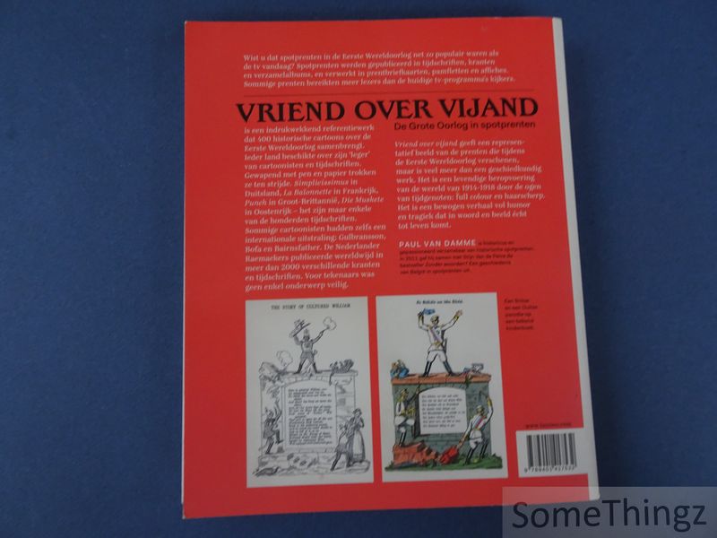 Unieke collectie cartoons over WO I uit meer dan 30 landen Dit bijzondere referentiewerk brengt een verrassende synthese van de Eerste Wereldoorlog aan de hand van 400 historische cartoons. Spotprenten vereenvoudigen de actualiteit en maken die begrijpbaar. Ze dragen bovendien een duidelijke boodschap uit en zijn gemaakt om het publiek te overtuigen. Daardoor zijn het geëngageerde tijdsdocumenten, die in dit boek in hun historische context worden gesitueerd: een verrassende invalshoek om geschiedenis naar het publiek te brengen. Bovendien zijn goede spotprenten niet minder dan echte kunstwerken. Meer dan 100 kunstenaars passeren in Vriend over vijand de revue.