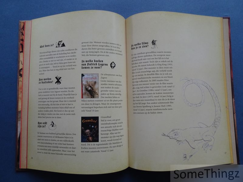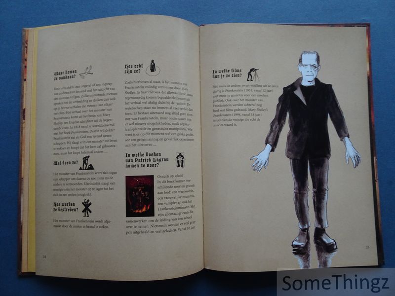 Het boek is opgevat als een rijk geillustreerd informatief jeugdwerk over griezelfiguren uit literatuur, folklore en populaire cultuur. Elk type wezen, zoals vampiers, weerwolven, mummies en andere monsters, wordt afzonderlijk besproken met uitleg over hun oorsprong, kenmerken en verschijningsvormen in verhalen en films. Daarnaast bevat het werk verwijzingen naar boeken en films waarin deze figuren voorkomen en wordt de lezer meegenomen door verschillende categorieën van griezelfiguren. Door de combinatie van korte informatieve teksten, paginagrote illustraties en thematische indeling fungeert het boek zowel als weetjesboek als als een visueel naslagwerk voor jonge lezers die interesse hebben in monsters en griezelverhalen. Patrick Lagrou is een Vlaamse jeugdauteur die bekendstaat om zijn avontuurlijke en griezelachtige kinderboeken. Hij schreef talrijke werken voor jongeren waarin spanning, fantasie en educatieve elementen worden gecombineerd. Zijn boeken richten zich vaak op mysterieuze onderwerpen en avonturen, en hij verwierf bekendheid binnen de Nederlandstalige jeugdliteratuur met series en thematische werken rond griezelfiguren en avonturenverhalen.