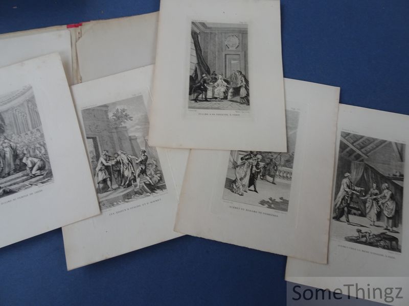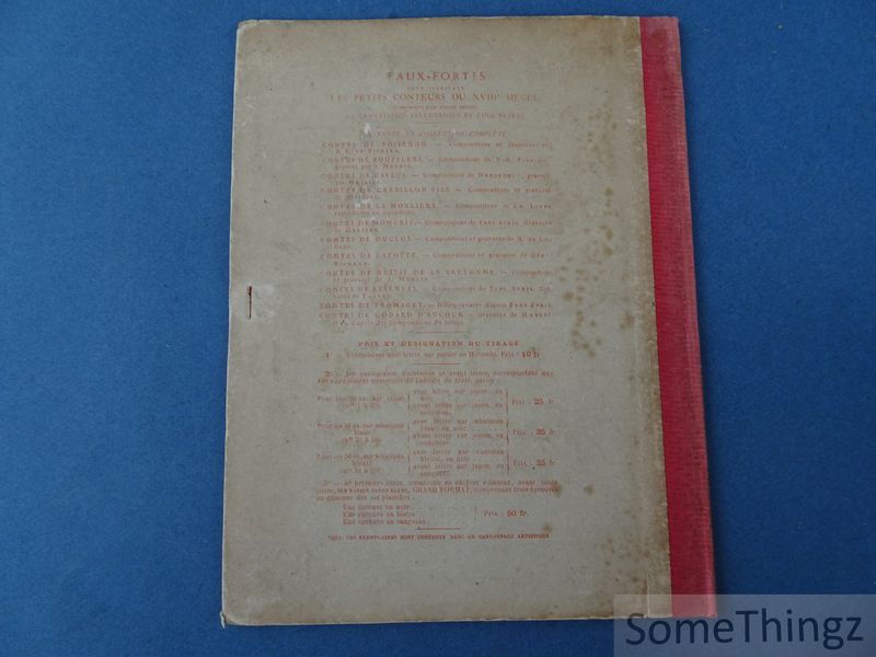 Portfolio avec 6 eaux-fortes (1 frontispice en 5 planches), 18.5x24cm., en bon état (manque le lacet de la chemise, portfolio avec traces d'usure). "Petits conteurs du XVIIIe siècle. Publiée par Octave Uzanne.".