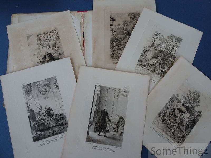 Eaux-fortes pour illustrer les contes de Pinot Duclos" est un portfolio artistique publié à Paris en 1882 par l'éditeur A. Quantin. L'ensemble contient une série d'eaux-fortes originales réalisées par l'artiste Ricardo de Los Rios pour illustrer plusieurs contes de l'écrivain français Charles Pinot Duclos. Les gravures évoquent l'atmosphère galante et satirique de la littérature du XVIIIe siècle et représentent des scènes inspirées des intrigues sociales et sentimentales caractéristiques de l'oeuvre de Duclos. Le portfolio fait partie de la collection bibliophilique "Petits conteurs du XVIIIe siècle", dirigée par Octave Uzanne, qui visait à redécouvrir et à illustrer des auteurs du siècle des Lumières pour les amateurs de livres illustrés et d'estampes. Le portfolio comprend six planches gravées à l'eau-forte par Ricardo de Los Rios: un frontispice allégorique et cinq planches illustrant différentes scènes tirées des contes de Charles Pinot Duclos. Les compositions représentent des situations narratives inspirées de la société française du XVIIIe siècle et mettent en scène des personnages aristocratiques dans des décors raffinés. Les gravures se distinguent par une grande précision du trait et par un souci particulier du détail dans les costumes, les expressions et les décors. L'ensemble s'inscrit dans la tradition des éditions bibliophiliques de la fin du XIXe siècle, période durant laquelle plusieurs éditeurs parisiens publièrent des portfolios d'eaux-fortes destinés à accompagner la redécouverte d'auteurs du XVIIIe siècle. Cette publication constitue ainsi un exemple représentatif de la collaboration entre littérature classique et illustration artistique dans l'édition française de cette époque. Charles Pinot Duclos (1704-1772) fut un écrivain et historien français associé à la littérature morale et satirique du XVIIIe siècle. Il est connu pour ses contes, ses essais et ses observations critiques sur la société de son temps. Membre de l'Académie française, il participa activement à la vie intellectuelle de l'époque des Lumières. Ricardo de Los Rios (1846-1929) était un artiste et graveur espagnol actif en France dans la seconde moitié du XIXe siècle. Spécialiste de l'eau-forte et de l'illustration de livres, il participa à plusieurs éditions bibliophiliques illustrées et contribua au renouveau de l'estampe artistique qui caractérisa la production éditoriale parisienne de la fin du XIXe siècle.