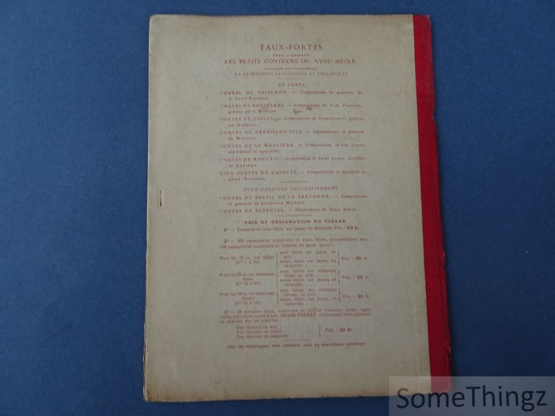 Portfolio avec 6 eaux-fortes (1 frontispice en 5 planches), 18.5x24cm., en bon état (manque le lacet de la chemise, portfolio avec traces d'usure, gravures avec des petites rouseurs ou un peu jauni). "Petits conteurs du XVIIIe siècle. Publiée par Octave Uzanne.".
