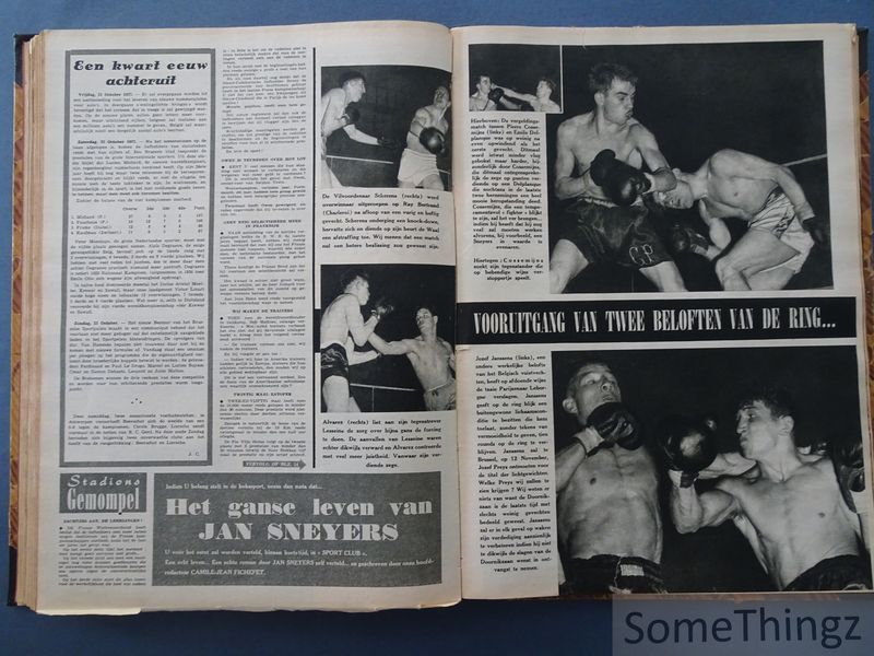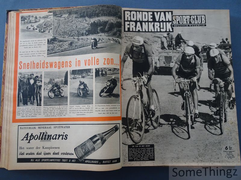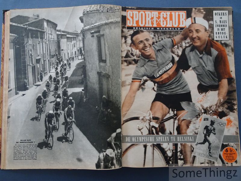 Volledige inhoud: 4 juni 1952: n°264, 265, 266, 267, extra nummer (28pp.) Ronde van Frankrijk 52, 268, 269, 270, 271, 272, 273, 274, 275, 276, 277, 278, 279, 280, 281, 282, 283, 284, 285, 286, 287, 288, 289, 290, 291, 292, 293, 294, 295, 296 (speciaal nummer, 28pp.) en 297. In de vroege jaren vijftig vormde het weekblad Sportclub (later Sport & Club) een onmisbaar venster op de Belgische sportwereld. Uitgegeven door Meuwissen in Brussel en gekenmerkt door zijn rijke helio-offset illustraties, bracht het tijdschrift sport tot leven in een tijd waarin televisie nog in zijn kinderschoenen stond. Dit weekblad is historisch cruciaal omdat het de heroïek van de eerste naoorlogse sportieve hoogtijdagen vastlegde. In deze bundeling (juni - december 1952) wordt aandacht besteed aan de belangrijkste nationale en internationale wielerwedstrijden (als daar zijn de Giro, de Tour de France, de ronde van Zwitserland, enz.), de Olympische Spelen van Helsinki en de start van de nieuwe Belgische voetbalcompetitie. Maar ook andere sporten zoals de motorsport, boksen, atletiek, baanwielrennen, rallysport enzoverder komen aan bod. Prachtige sportfoto's geven een visuele impressie van de sportbeoefening in de jaren '50. Het blad fungeerde als een luxe verzamelstuk, vaak door liefhebbers ingebonden om de iconische zwart-wit covers en diepgaande verslagen van nationale triomfen te bewaren. De bundel omvat een reeks opeenvolgende weeknummers van Sport & Club en vormt daarmee een doorlopende documentatie van sportnieuws in de tweede helft van 1952. De inhoud bestaat uit wedstrijdverslagen, sportanalyses, interviews en reportages over uiteenlopende disciplines, met nadruk op voetbal en wielrennen als dominante sporten in België. Daarnaast bevatten de nummers advertenties, redactionele bijdragen en illustraties die inzicht geven in de sportcultuur en mediavormgeving van de jaren 1950. Als gebundelde jaargang biedt het werk een waardevolle bron voor onderzoek naar sportgeschiedenis en journalistieke praktijk in die periode.