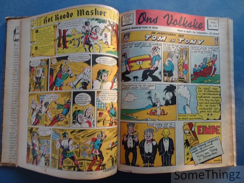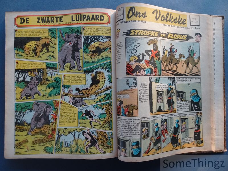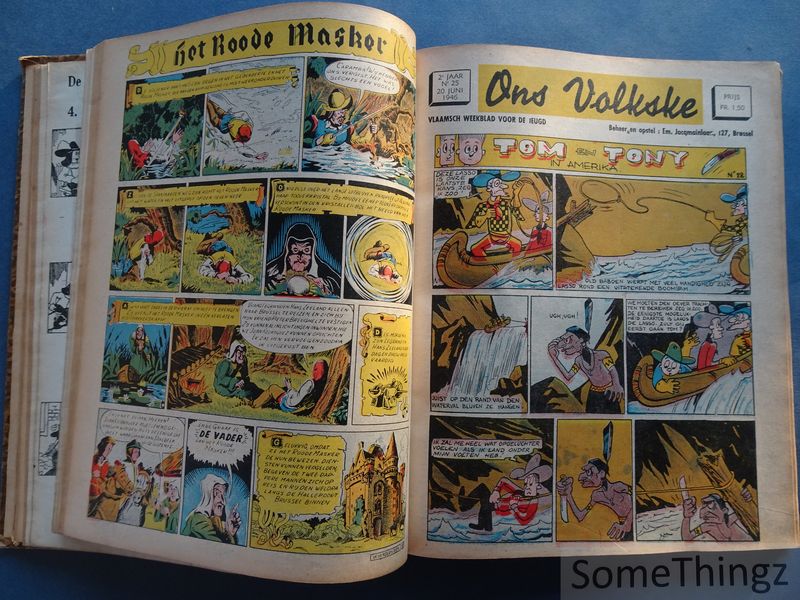 Schaarse en gezochte bundeling. In redelijke tot goede staat: soms wat kort afgesneden langs de marges maar zonder tekstverlies, 1e en laatste pagina van deze bundeling zijn langs de naad verlijmd met het schutblad, titelblad van nummer 40 is gescheurd maar aanwezig, kruiswoordraadsels zijn soms ingevuld Curiosum: het eerste nummer (2e jg., nr. 5) lijkt een misdruk aangezien het rood in de kleurendruk op de 1e en laatste pagina niet uitgelijnd is. "Ons Volkske" was een invloedrijk Vlaams jeugdweekblad dat kort na de Tweede Wereldoorlog verscheen als bijlage van de krant 'Ons Volk'. Het blad bood jongeren een combinatie van ontspanning en opvoeding via strips, verhalen en educatieve bijdragen. De jaargang 1946 weerspiegelt de heropbouwperiode in Vlaanderen en vormt een belangrijk document binnen de ontwikkeling van de Vlaamse stripcultuur, met bijdragen van toonaangevende auteurs zoals Willy Vandersteen en Marc Sleen. De tweede jaargang van 1946 bevat een doorlopende reeks wekelijkse nummers waarin stripverhalen een centrale plaats innemen. Tot de belangrijkste reeksen behoren de strips van Willy Vandersteen, waaronder 'Het rode masker', 'De vroolijke bengels', 'Ridder Gloriant', 'De heldentocht der Bataven' en 'De zwarte luipaard'. Deze verhalen tonen vroege kenmerken van Vandersteens vertelstijl, met een combinatie van avontuur, historische thematiek en dynamische beeldvoering. Daarnaast bevat het blad bijdragen van Marc Sleen, met onder meer ?De avonturen van 'Tom en Tony' en 'Stropke en Slopke'. Deze reeksen illustreren Sleens vroege werk binnen de Vlaamse striptraditie en tonen zijn evoluerende stijl, gekenmerkt door humor, maatschappijkritiek en een vlotte narratieve opbouw. Naast strips omvat de publicatie korte verhalen, feuilletons en informatieve rubrieken gericht op jeugdige lezers. De inhoud combineert ontspanning met opvoedkundige elementen, waarbij waarden zoals solidariteit, moed en gemeenschapszin centraal staan. De visuele en tekstuele bijdragen maken de bundel tot een representatief voorbeeld van naoorlogse Vlaamse jeugdpers en stripcultuur. Willy Vandersteen is een van de belangrijkste Vlaamse stripauteurs en de schepper van onder meer 'Suske en Wiske'. In de jaren 1940 werkte hij voor verschillende kranten en weekbladen, waaronder 'Ons Volkske', waar hij experimenteerde met avonturenverhalen en historische strips. Zijn werk in deze periode vormt een belangrijke stap in de ontwikkeling van zijn latere succesreeksen. Marc Sleen is een invloedrijke Vlaamse striptekenaar, vooral bekend van 'Nero'. Hij begon zijn carrière in de naoorlogse pers en leverde bijdragen aan diverse publicaties, waaronder 'Ons Volkske'. Zijn vroege werk toont reeds de humoristische en satirische stijl die later zijn handelsmerk zou worden. / Ons Volkske was een langlopend Vlaams stripblad dat van 1932 tot 1988, met uitzondering van de periode tijdens de Tweede Wereldoorlog, onafgebroken verscheen. Het was de jeugdbijlage bij het weekblad "Ons Volk". Jarenlang was het samen met 't Kapoentje het belangrijkste stripblad in Vlaanderen. Het eerste nummer van "Ons Volkske" verscheen op 25 september 1932, uitgegeven door n.v. Periodica. Afgezien van de strip "Adamson" door Oscar Jacobsson werden alle beeldverhalen in het blad getekend door Eugeen Hermans, alias Pink. Toen in 1940 de Tweede Wereldoorlog uitbrak werd de publicatie vijf jaar lang stopgezet. Na de bevrijding verscheen het vanaf 11 maart 1945 opnieuw als bijlage bij "Ons Volk". Na 42 nummers werd het voortgezet als zelfstandig weekblad, uitgegeven door n.v. De Gids. In die jaren publiceerde het magazine onder meer werk van Marc Sleen (Tom en Tony, Stropke en Flopke, De Avonturen van Piet Fluwijn en Bolleke), Willy Vandersteen (Ridder Gloriant, Het Rode Masker, De heldentocht der Bataven, De zwarte luipaard, De Vrolijke Bengels) en van de Nederlandse stripauteurs Piet van Elk, Henk Albers en Albert van Beek. In 1947 werd de titel "Ons Volk" door De Standaard teruggevorderd. Hierdoor werden de series in Ons Volkske door n.v. de Gids vervolgd in het nieuwe blad 't Kapoentje. De Standaard bracht Ons Volkske daarna vanaf 1 mei 1947 opnieuw uit als dagbladbijlage. Vanaf 13 januari 1949 werd "Ons Volkske" opnieuw een zelfstandig weekblad. Onder de tekenaars die in dit blad hun werk publiceerden vinden we onder meer ook nog Bob De Moor, Gommaar Timmermans, Hurey, Gilbert Declercq, Gert Ronde, Karel Verschuere, Jo-El Azara, Tibet en ook reeksen die eerder al in Kuifje verschenen. Vanwege de lagere prijs en het goedkopere drukpapier werd "Ons Volkske" daarom ook weleens de armere versie van het weekblad Kuifje genoemd. Desondanks was het jarenlang samen met "'t Kapoentje" het toonaangevende stripblad in Vlaanderen en een van de populairste jeugdmagazines. Het blad werd in 1988 opgedoekt. (uit: wikipedia 23-4-2026)