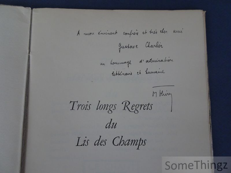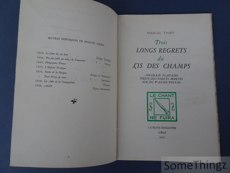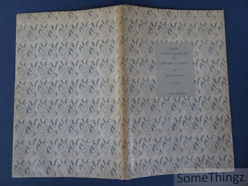 Trois longs regrets du lis des champs (Liège, La Flûte enchantée, 1955) est un petit recueil de poésie et de proses lyriques de Marcel Thiry, composé d'une série de pièces où se succèdent «Anabase platane», «Prose des forêts mortes», «Air du wagon postal» mêlant paysages, errances et méditations sur le temps. L'ouvrage se caractérise par une tonalité mélancolique - souvenances de voyage, évocations de la nature et interrogations existentielles - tout en conservant la précision d'un langage travaillé. C'est une édition originale limitée (tirage sur papier Virginal, exemplaires numérotés) destinée aux amateurs de poésie belge francophone du XXe siècle. Marcel Thiry (13 mars 1897 - 5 septembre 1977) est un poète francophone belge né à Charleroi. Auteur réputé de la littérature belge du XXr siècle, il a publié de nombreux recueils de poésie et quelques romans; sa carrière littéraire s'étend sur plusieurs décennies et rassemble des oeuvres comme Âges (1950) et d'autres recueils repris dans les oeuvres poétiques complètes. Sa poésie mêle souvent le souvenir historique, l'expérience du voyage et une attention vive au paysage; Thiry fut aussi actif dans la vie culturelle belge et reconnu par des institutions littéraires.
