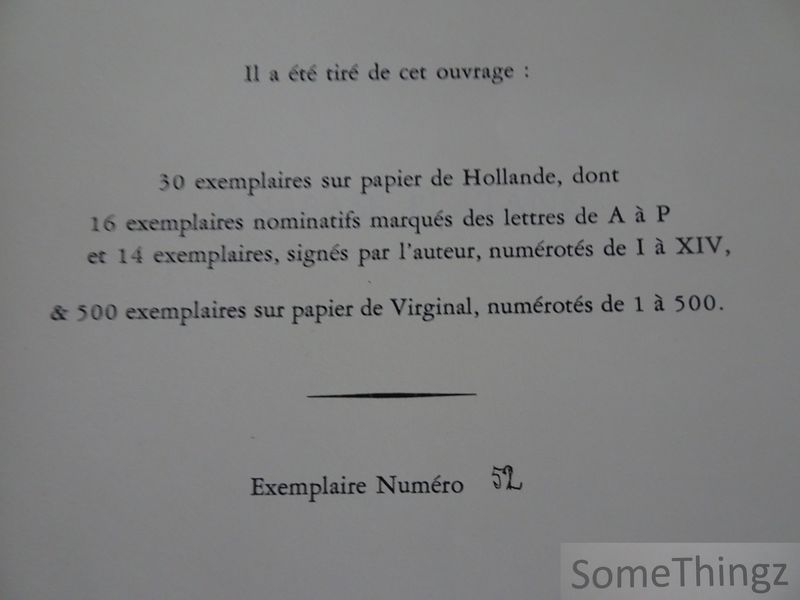 Broché, couverture rempliée, 31pp., 16.5x25.5cm., en très bon état (traces d'un tampon effacé sur la page de titre). N°52 de 500 exemplaires sr papier de Virginal. Avec une belle dédicace de l'auteur à Gustave Charlier.
