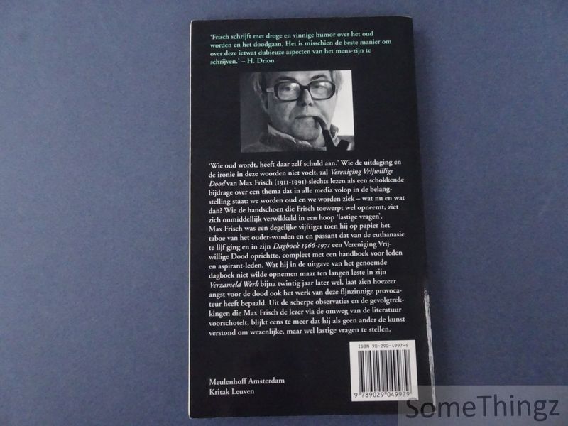 'Vereniging Vrijwillige Dood' is een literaire roman van Max Frisch, vertaald in het Nederlands door Hans Hom. Het verhaal volgt een groep oudere heren die samenkomen in wat zij noemen een 'vereniging' met het idee om hun leven vrijwillig te beëindigen. In dagboekachtige fragmenten schetst Frisch op ironische en reflectieve wijze de dialogen, twijfels, filosofische overpeinzingen en absurditeiten rondom hun gezamenlijke plan. Het boek onderzoekt thema's zoals verantwoordelijkheid, individualiteit, zin van het leven en de menselijke neiging tot escapisme en zelfreflectie. Max Frisch (1911-1991) was een Zwitsers schrijver en toneelschrijver die vooral bekendstaat om zijn existentialistische en filosofische proza. Zijn werk onderzoekt vaak thema's als identiteit, verantwoordelijkheid, samenleven en de rol van het individu in de moderne maatschappij. Frisch's stijl kenmerkt zich door heldere, ironische taal en diepgaande reflecties op gedragsnormen en menselijke motieven. Zijn romans worden internationaal gewaardeerd en zijn in vele talen vertaald.