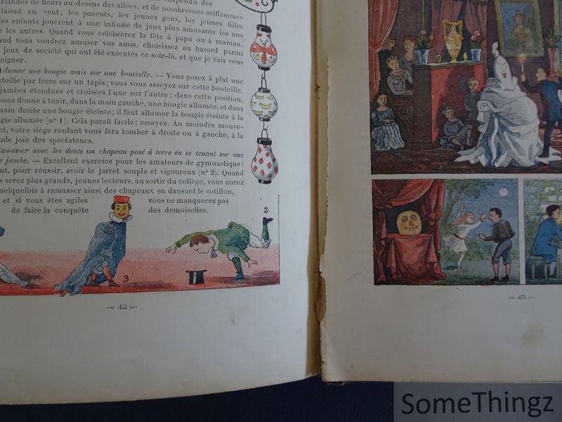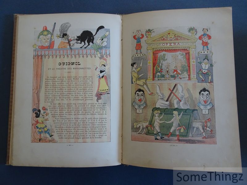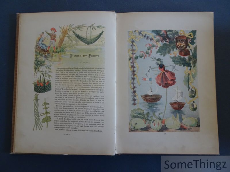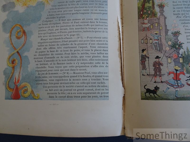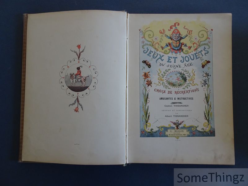 Édition originale de ce superbe livre, fruit de la collaboration des frères Tissandier. Chaque page est illustrée en lithographie d'après des peintures d'Albert Tissandier. Si les talents de vulgarisateur de Gaston Tissandier, aéronaute et directeur de La Nature éteint bien connus, les talents d'aquarelliste de son frère sont révélés ici. Chaque page est illustrée en couleurs d'illustrations à pleine page ou d'encadrements formés de vignettes et d'ornements : ballons, cerfs volants, cartes à jouer, animaux, jouets, marionnettes, etc.